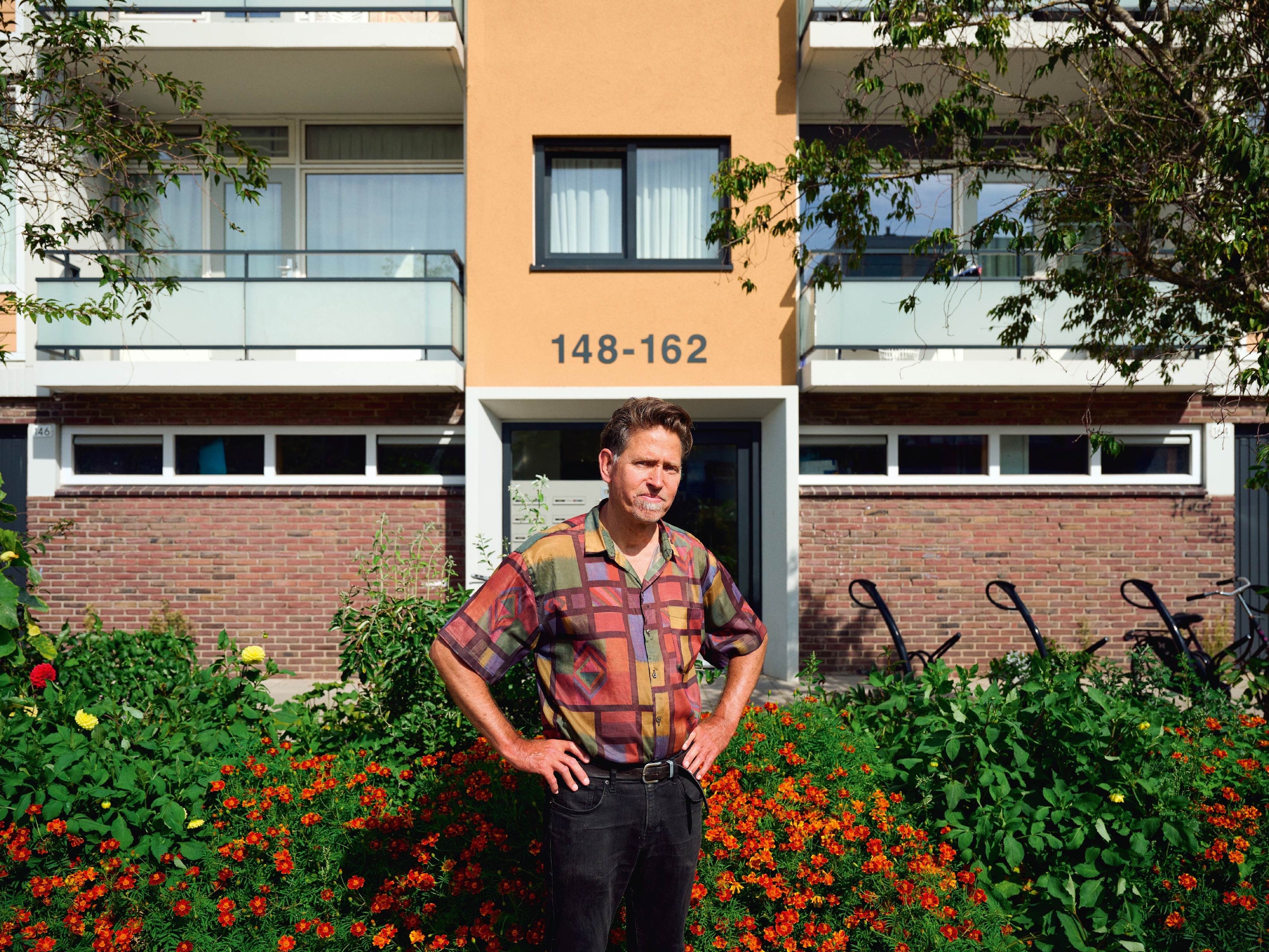 "Even dat zwerfafval weghalen", zegt Coen Mobach. Hij stapt de tuin voor zijn huis in en verwijdert een plastic zak. "Dit was eerst een grasveld op stoepniveau, maar er parkeerden steeds auto's op deze plek", legt hij uit. "Daarom vroeg ik de gemeente of we er een gezamenlijke tuin van mochten maken. Dat staat vriendelijk én het groen werkt goed tegen hittestress. Samen met een aantal buren uit mijn trappenhuis adopteerde ik dit stukje grond."